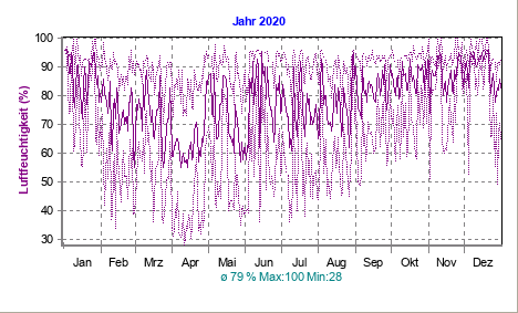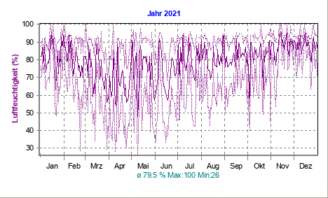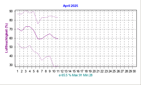 mittl. Feuchtigkeit (10 Min.): 82 % Maximum (Tag): 91 % (12:39 h)