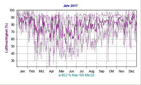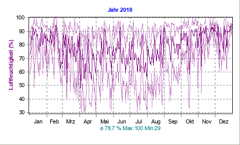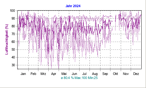 aktuelle Luftfeuchtigkeit: 82 % Minimum (24 h): 73 % (23:25 h)